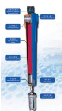 過(guò)濾器在過(guò)濾時(shí),壓縮空氣先進(jìn)入濾芯中間向四周擴(kuò)散,經(jīng)過(guò)濾芯過(guò)濾后進(jìn)入濾芯與殼體的間隙,再通過(guò)過(guò)濾器出口排出下游。壓縮空氣中的固體懸浮物被濾芯(纖維)捕捉后留在內(nèi)部、液體(如凝結(jié)水、油霧等)被濾芯(纖維)捕捉后由于其重力的作用流至濾芯低部,通過(guò)海綿的“潮濕帶”(在“潮濕帶”處由于壓力降較大沒(méi)有空氣流過(guò),故稱為“安靜區(qū)”,流至過(guò)濾器殼體底部,由自動(dòng)排水器排至外界。