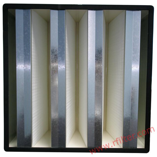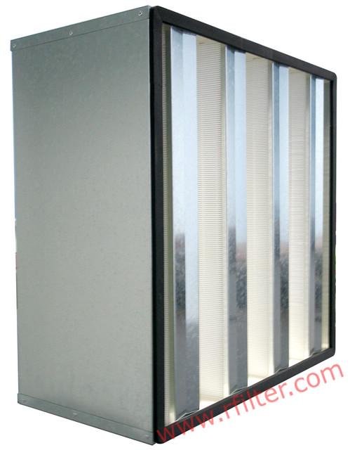 組合式高效過濾器由多片無隔板濾芯組成V形結構,安裝在噴塑的鍍鋅鋼板或者ABS濾料箱體中制成。與普通過濾器相比,這種構造極大的增加了濾料數量,在現有的系統安裝中,較大的過濾器濾料面積保證了較低壓損,從而降低了能源消耗,節省了運行成本。